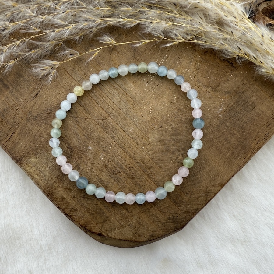 Deze combinatie is bijzonder! De armband voelt lief en verkoelend aan. Verhitte emoties en verdriet komen tot rust; troost wordt geschonken. Het hart mag zich openen om emoties te laten stromen. Zo kun je jezelf weer terugvinden na een emotionele gebeurtenis. Hij werkt sterk in op het hartchakra en helpt je om terug te gaan naar het gevoel en schenkt je de gelegenheid om meer zelfliefde te ervaren. Hij helpt je positief in het leven te staan en om te genieten. Hij bevordert het geven van liefde en trekt liefde aan. Daarnaast ontspant hij en helpt je de prestatiedruk los te laten. Morganiet bevordert de spirituele ontwikkeling.