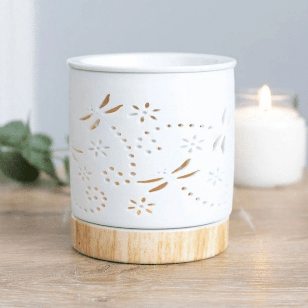 Deze aroma brander is van keramiek met een mate afwerking. Wanneer het kaarsje brand en het licht van de vlam vonkelt door de gaatjes en schittert op de muur is de brander op zijn mooist. De geur van de etherische olie verspreid zich subtiel door de ruimte.