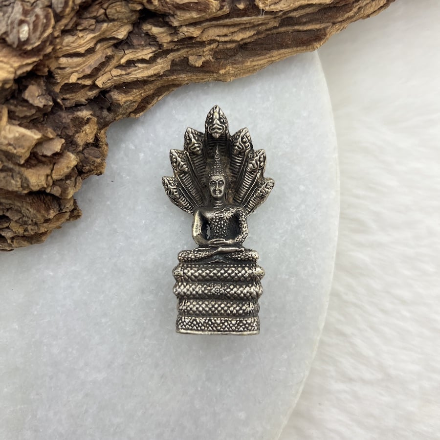 - Houding: De Boeddha zit in lotushouding, mediterend, met de zevenkoppige slang Mucalinda die een dak vormt boven zijn hoofd.