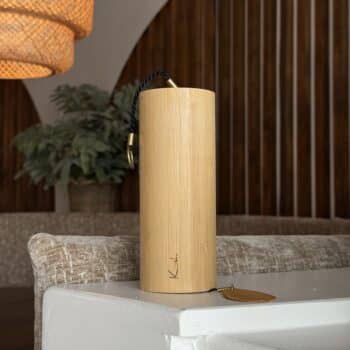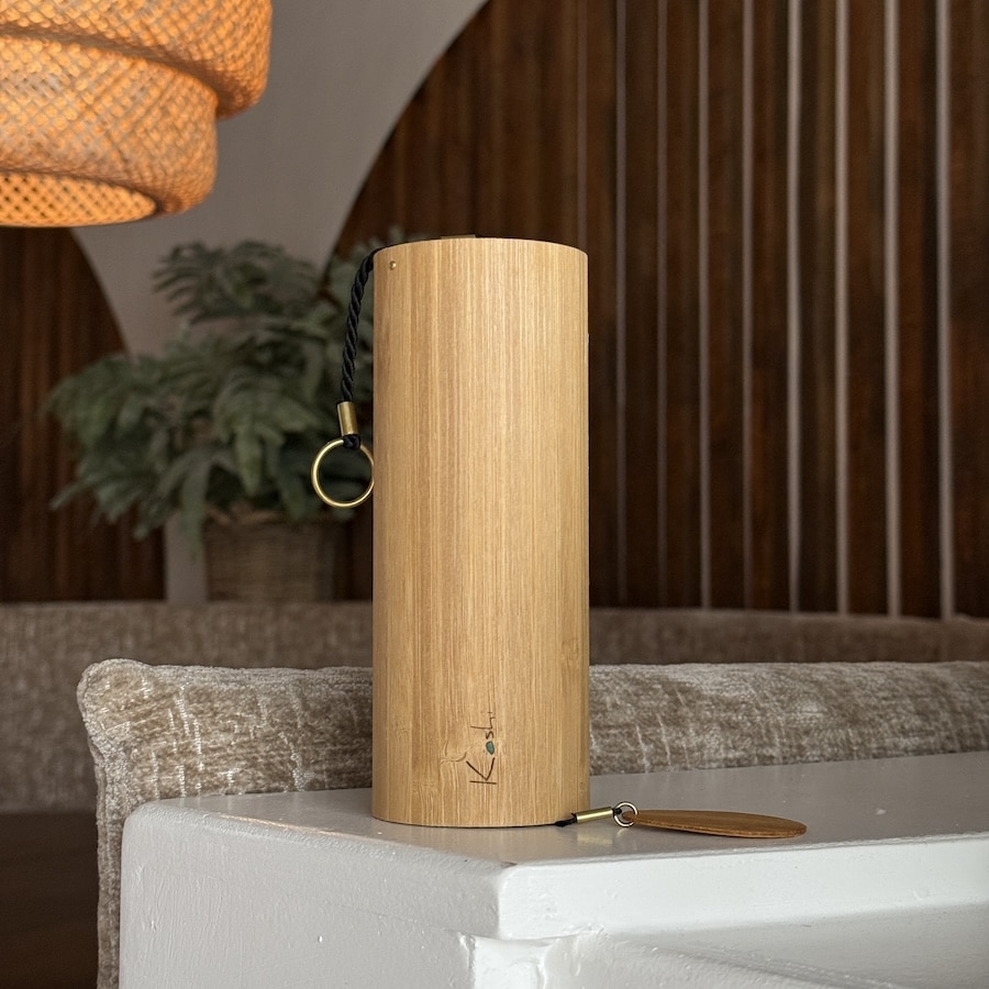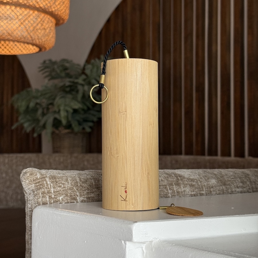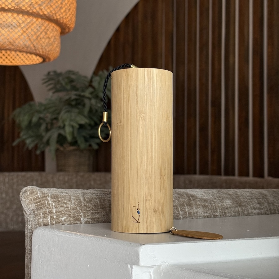 Pak het instrumentje aan de bovenkant vast en draai zachtjes rond of draai het rond aan het snoer. Je kunt de Koshi ook bij een raam of deur hangen waar af en toe een briesje door waait. Bij voorkeur niet buiten hangen. Als je het Koshi windspel wel buiten wilt ophangen, dan alleen onder een afdak, en behandel het bamboe dan elke 2 maanden even met teakolie.