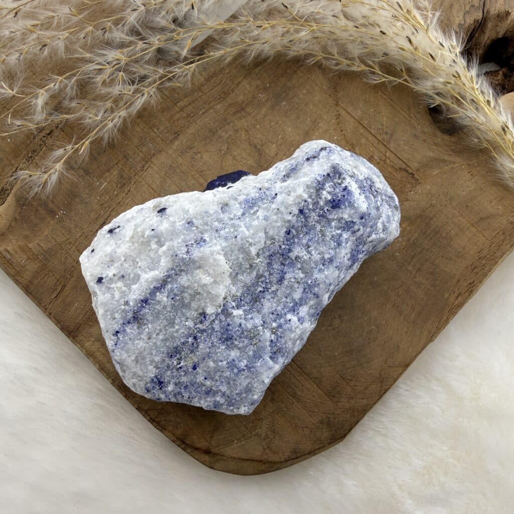 Door de blauwe kleur heeft deze steen affiniteit met het keel chakra. Alle klachten die voortkomen door disbalans van het keelchakra kunnen worden ondersteund. Denk aan klachten aan de keel, strottenhoofd, stembaneden en schildklier.