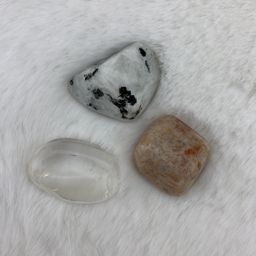 De maansteen helpt je om het vrouwelijke aspect van de volle maan te omarmen en daarom ook je eigen vrouwelijkheid. De zonnesteen balanceert en verzacht de ervaringen die je kunt hebben tijdens de fase voor de volle maan. De bergkristal versterkt de twee andere stenen en daarnaast is deze steen goed om te reinigen en op te laden.