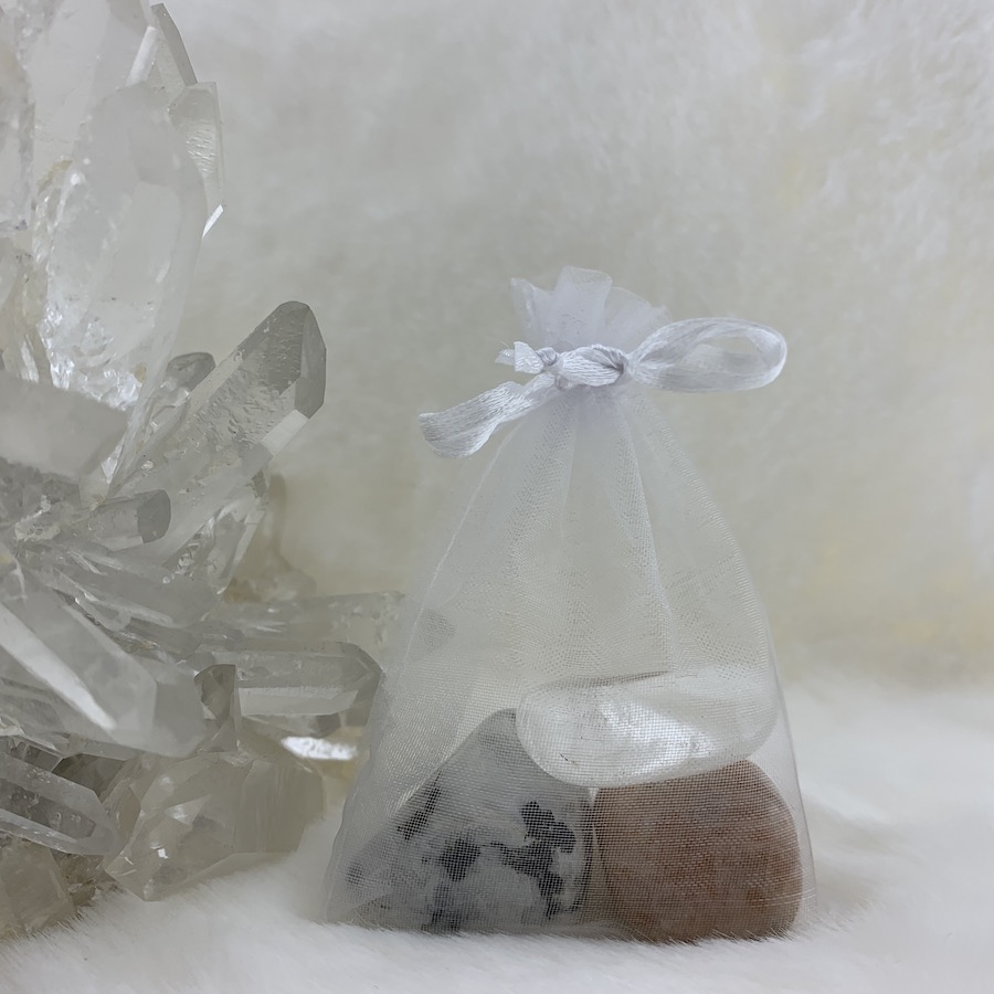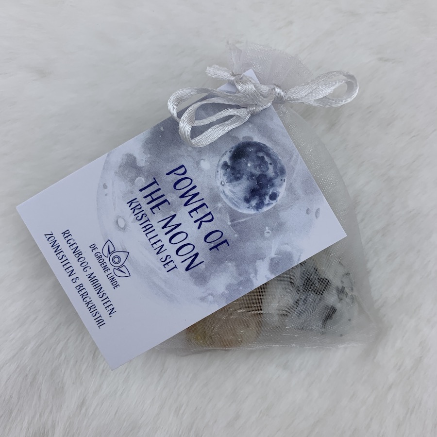 Deze kristallen set bestaat uit: Regenboog maansteen, Zonnesteen en Bergkristal. Je ontvangt het setje in een zakje met kaartje.