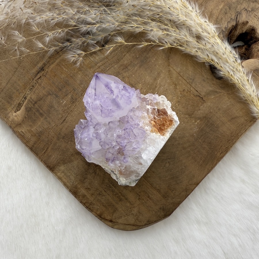 Spirit Amethist wordt vaak gezien als een kristal van transformatie en diepe heling. Het bijzondere is dat het niet alleen op jou persoonlijk werkt, maar ook in verbinding met de mensen en energieën om je heen. Door de vele kleine puntjes die samenkomen rond één centraal punt, verspreidt de steen zijn energie als een soort zachte, helende straal in alle richtingen. Het is alsof je wordt omhuld door een beschermende, liefdevolle deken van licht.