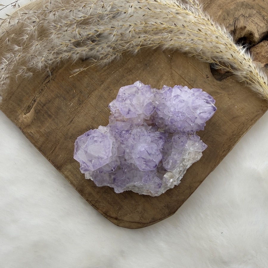 Spirit Amethist wordt vaak gezien als een kristal van transformatie en diepe heling. Het bijzondere is dat het niet alleen op jou persoonlijk werkt, maar ook in verbinding met de mensen en energieën om je heen. Door de vele kleine puntjes die samenkomen rond één centraal punt, verspreidt de steen zijn energie als een soort zachte, helende straal in alle richtingen. Het is alsof je wordt omhuld door een beschermende, liefdevolle deken van licht.
