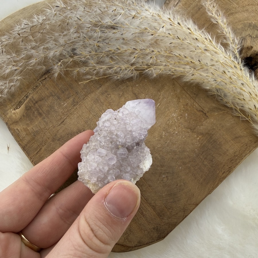 Spirit Amethist, ook wel Cactus Amethist of Spirit Quartz genoemd, is echt een bijzonder kristal. Je herkent het meteen aan de ene grote punt die omringd wordt door allemaal kleine puntjes. Daardoor lijkt het alsof het kristal een fonkelende jas draagt die schittert in het licht. Deze schoonheid komt maar uit één plek ter wereld: Zuid-Afrika.