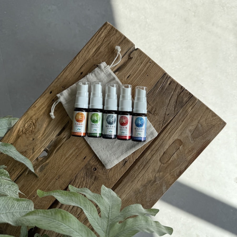 Omdat er vijf elementen zijn en wij precies vijf flesjes in een themabag kwijt kunnen, leek dit ons een mooie aanvulling op ons assortiment. In de Themabag De Vijf Elementen zitten de vijf geurfrequenties in 10 ml sprays, ideaal om mee te experimenteren of om het hele jaar door te gebruiken. Dit omdat de elementen meebewegen met de seizoenen. Hierdoor is dit pakketje perfect voor iedereen die zich verdiept in de traditionele Chinese filosofie en geneeskunde. Maar ook als je er nog niet veel vanaf weet, is dit een fijne manier om ermee kennis te maken en je te laten ondersteunen door deze vijf bijzondere geuren: