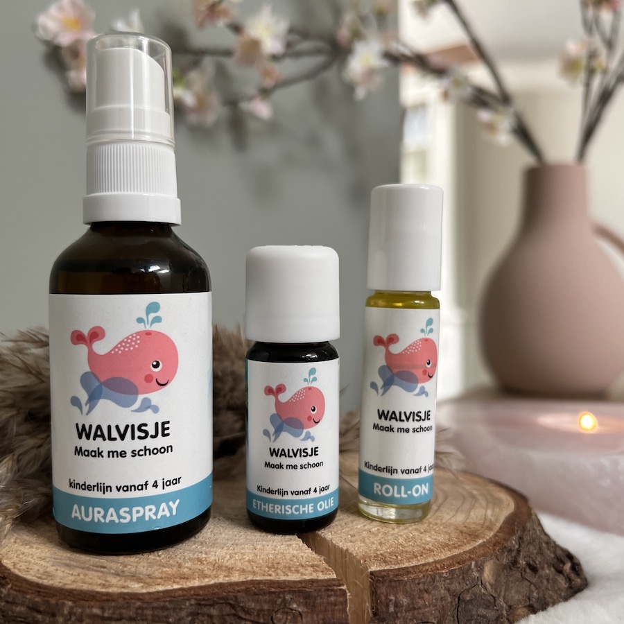 Auraspray: Een effectieve en snelle manier om de Walvisje reinigende olie om het kind heen te krijgen. Spray een paar keer boven het hoofd en om het kind heen. Doe dit met gesloten ogen en hou de adem 5 tellen in. Zo kan de alcohol verdampen en heeft je kind daar geen last van. Laat de nevel even neerdalen om zo het effect te vergroten.
